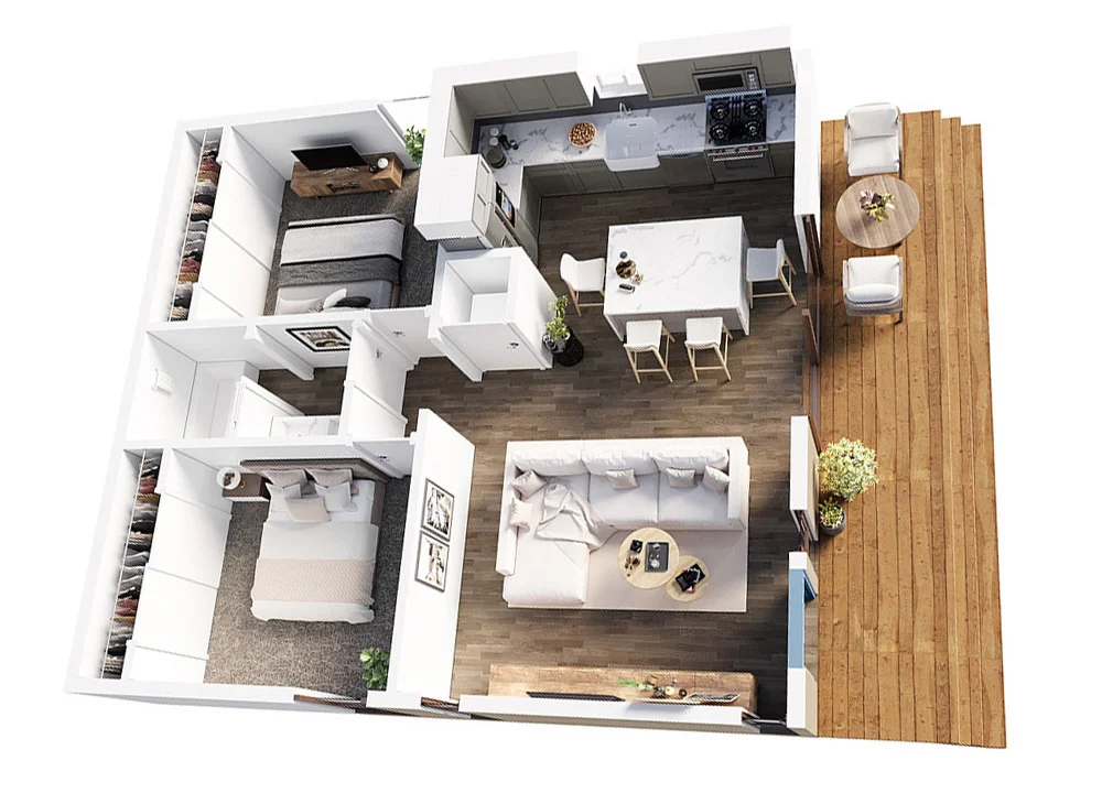 OneStop ADU’s two bedroom/one bathroom floorplan has been designed with City of San Diego regulations in mind. Impact fees are currently waived for all backyard homes less than 750 sq ft, saving thousands. This design boasts a sliding door, stackable washer/dryer, spacious living/dining area, and a full-size kitchen with an island, accent lighting and a dishwasher.